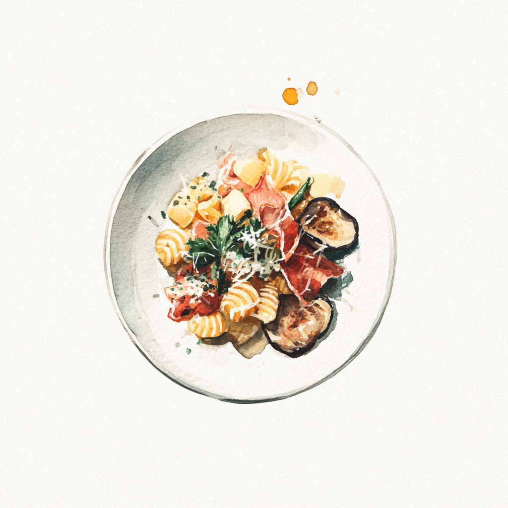 Chipolata, bruine jus, gelakte peer met tijm en union square nuts, gebakken aardappelen met kruiden.
