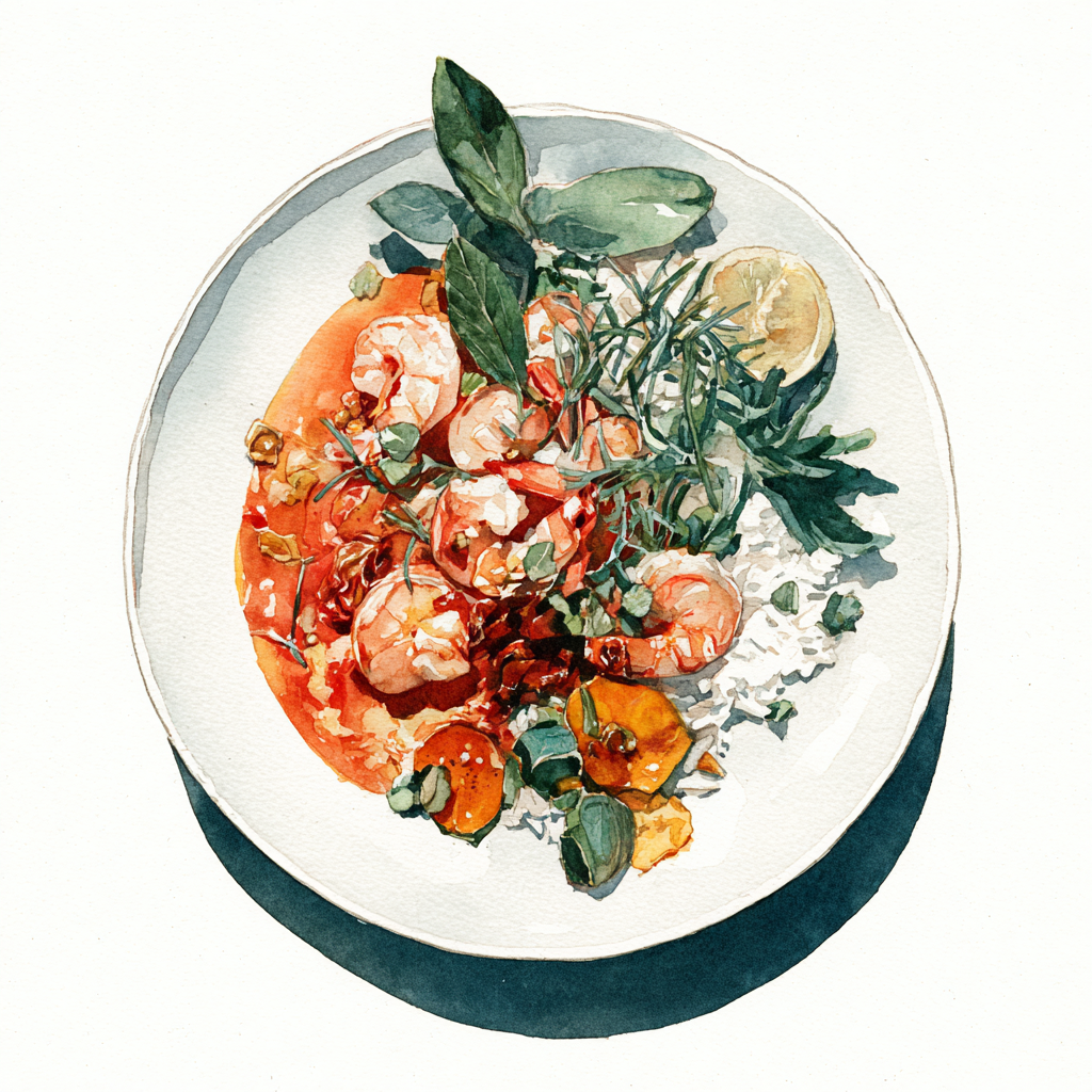 Scampi’s,saus met rode kerrie, gebakken prei, pompoen en wortelen, basmatirijst.